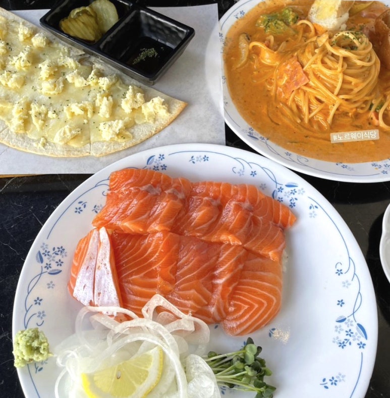 입에 넣자마자 사르르 녹는 연어의 식감이 좋고 파스타와 피자 세트 구성도 최고에요 🧡